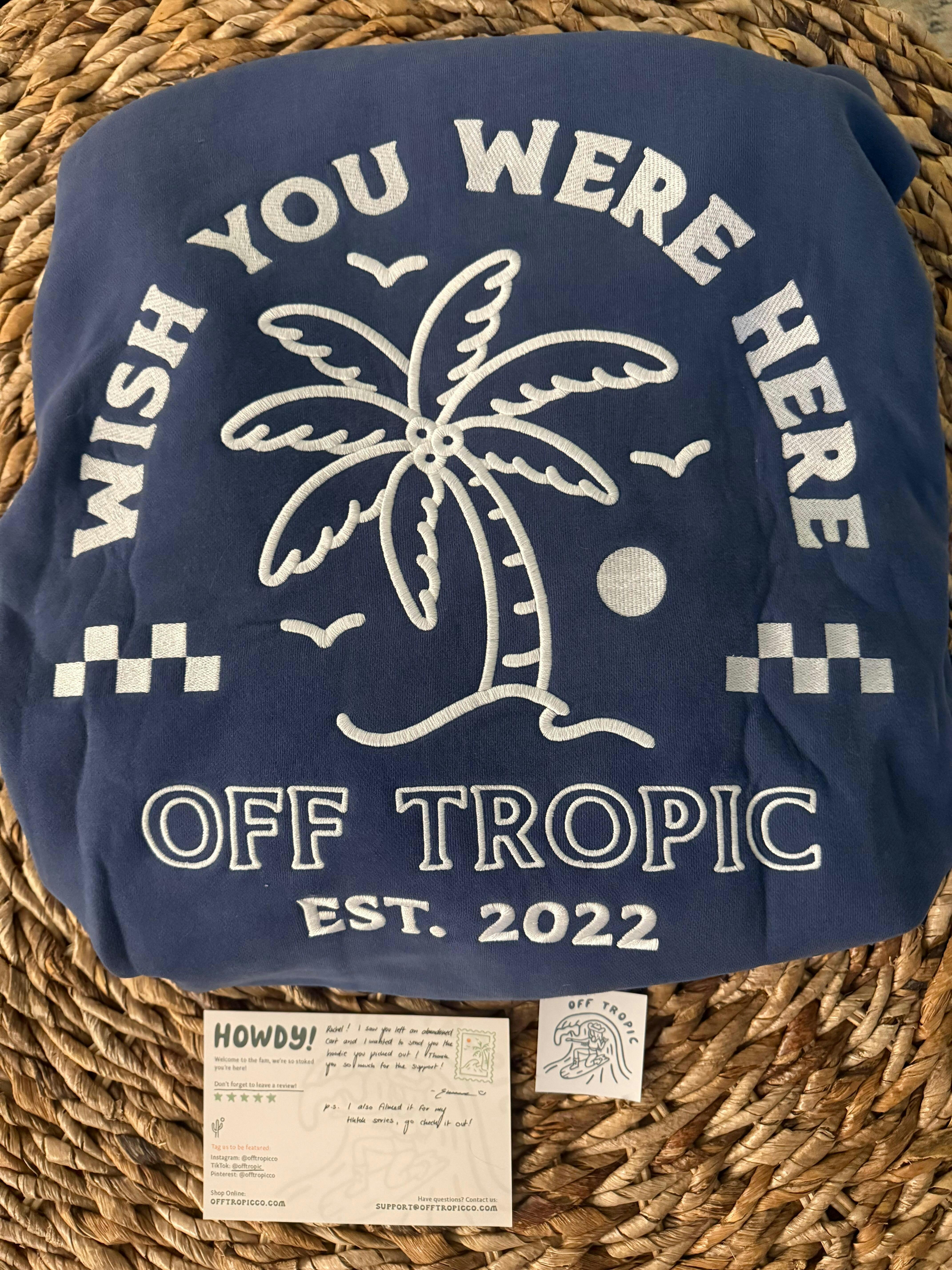 The Wish You Were Here Hoodie was made for slow mornings, sea breeze days, and cool summer nights. Featuring a fully embroidered back design, with matching embroidered details on the wrist and front for that extra Off Tropic touch.