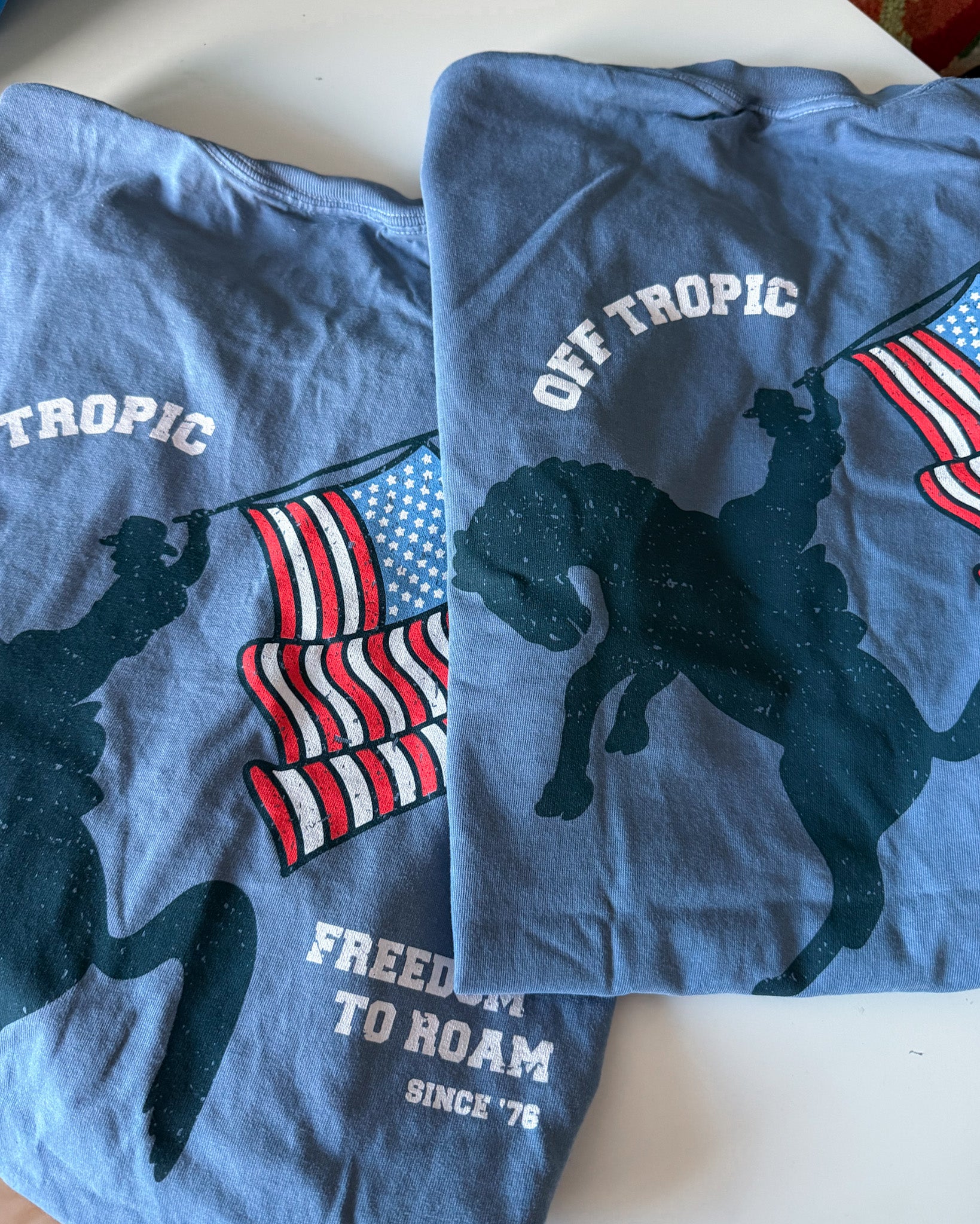 Our updated American Cowboy Tee with flaws. We consider this tee to be a "seconds" piece that we cannot sell at full price.