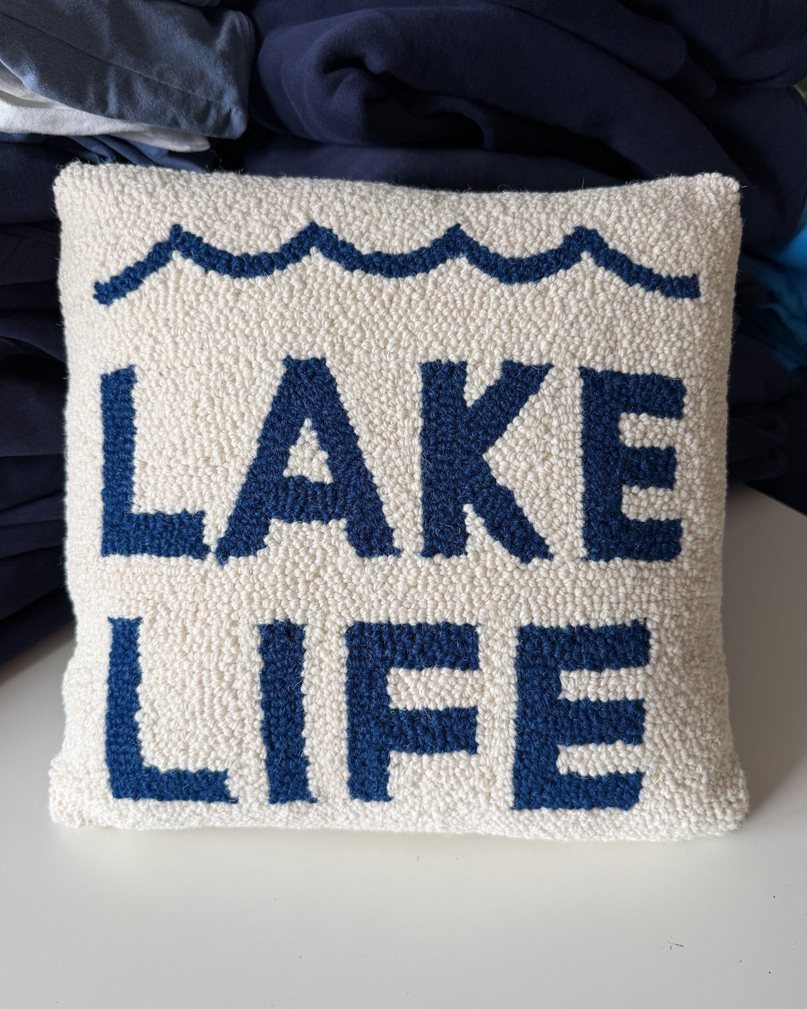 Flawed Lake Life Hook Pillow. Pillow has slight markings on back. Could be spot cleaned.
